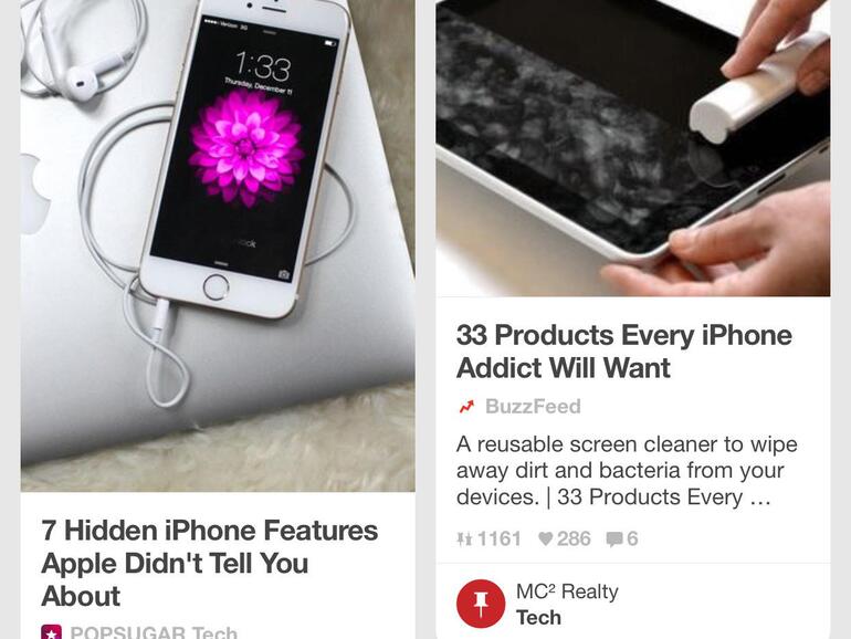 1 Nach dem Öffnen der App zeigt Pinterest den persönlichen Start-Feed an. Darin werden Pins in einem endlos scrollenden Raster angezeigt. Den Inhalt des Feeds kann der Pinterest-Nutzer beeinflussen, indem er Themen, Personen (Pinner) oder Pinnwänden anderer Personen folgt. Pins enthalten immer Links zum Ursprung, also einer Website, einem Shop oder einem Blog.