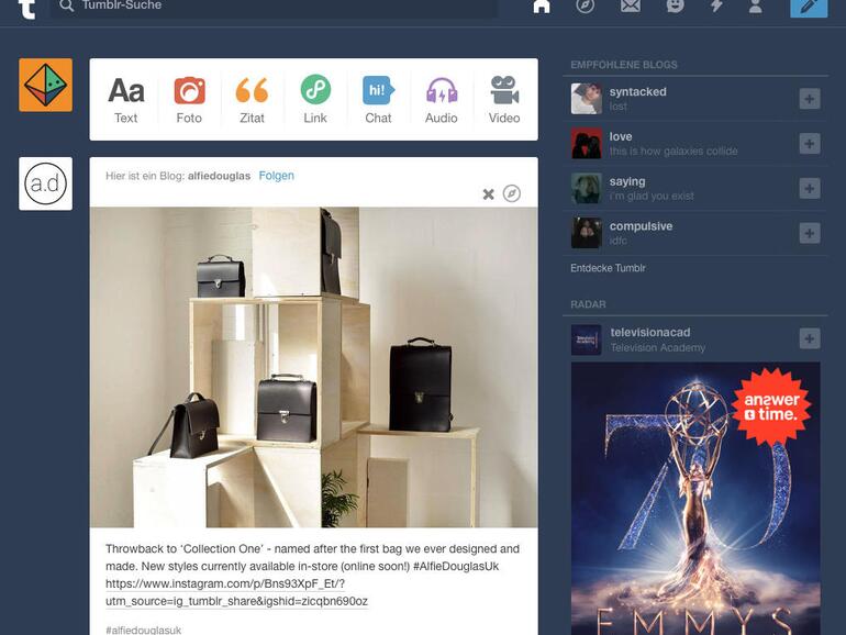 Tumblr ist im Gegensatz zu vielen anderen Netzwerken primär eine Plattform zum Bloggen – auch wenn die Beiträge oft bewusst kurz und grafisch gehalten sind. Viele Funktionen entstammen jedoch dieser Kernaufgabe.