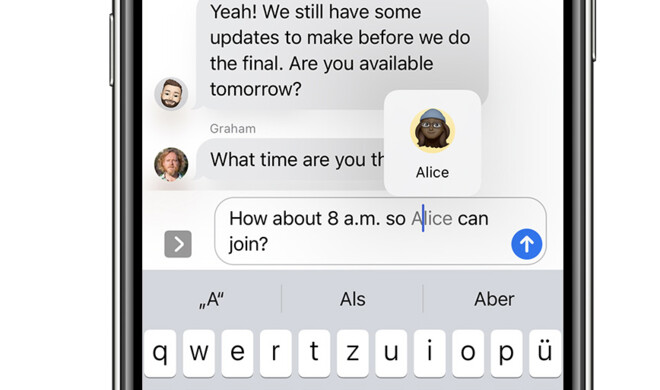 Gruppen hat Apple in iOS 14 ebenfalls mit neuen Features bedacht. In Familiengruppen kann man nun beispielsweise Personen direkt ansprechen, sodass diese eine Benachrichtigung erhalten und aufmerksam gemacht werden können, dass sie gemeint sind. Gibt man den Namen ein, wird er zunächst grau hinterlegt. Ein Tipp darauf und schon lässt sich der Kontakt als Erwähnung auswählen.