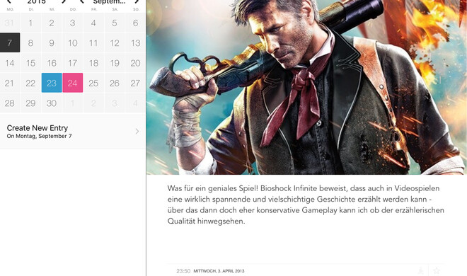 „Mein liebes Tagebuch …“ – wer auf dem iPad Gedanken, Erlebnisse und Ereignisse festhalten möchte, kommt an Day One nicht vorbei. Apple gefiel die App so gut, dass sie 2014 mit einem Apple Design Award ausgezeichnet wurde. Der Ritterschlag erfolgte vollkommen zu Recht, denn Day One ist nicht einfach nur eine digitale Kladde, in der sich schnell Texte festhalten lassen. Darüber hinaus integriert sich die App perfekt in iOS, Inhalte wie etwa Fotos oder Internetseiten lassen sich pfeilschnell in Day One integrieren. Die übersichtliche Organisation der einzelnen Einträge durch einen in die App integrierten Kalender und viele Komfortfunktionen erleichtern das regelmäßige Führen des persönlichen Journals. Day One kostet als zum iPad- und iPhone kompatible Universal-App mit iWatch-Anbindung 5 Euro, die Mac-Version ist für 10 Euro zu haben.