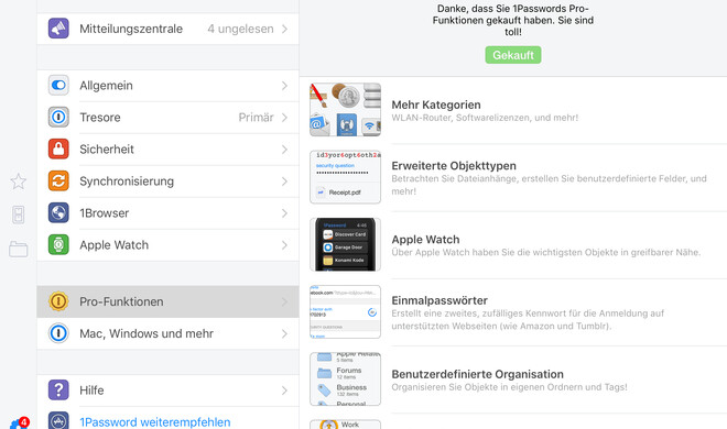 Unsere digitale Identität besteht aus unzähligen Logins und Passwörtern. 1Password versteht sich als Tresor für all diese sensiblen Daten und hilft beim Erstellen und Erneuern von Passwörtern. Darüber hinaus integriert die App einen Webbrowser und klinkt sich als Erweiterung direkt in das Betriebssystem ein, um so das Einloggen in Webseiten zu vereinfachen. Im Alltag muss man sich so nur das Master-Passwort merken oder das Gerät via Touch ID entsperren, alles andere erledigt die App. 1Password ist plattformübergreifend erhältlich, die iOS-App synchronisiert ihre Daten auf Wunsch mit den Windows- , OS-X- und Android-Versionen – so sind alle Logins überall auf dem gleichen Stand. Die Grundversion ist kostenlos erhältlich, die Pro-Funktionen lassen sich über einen 10 Euro teuren In-App-Kauf freischalten.