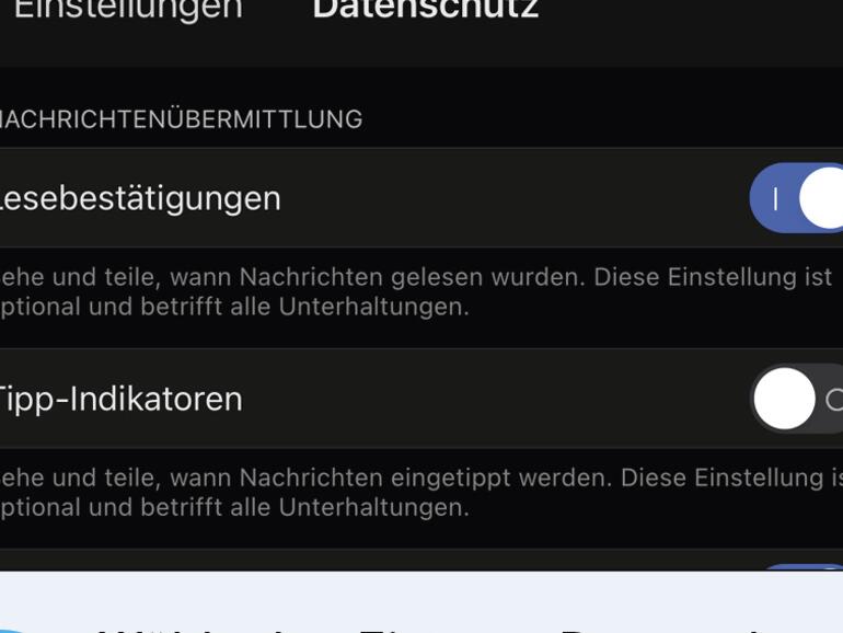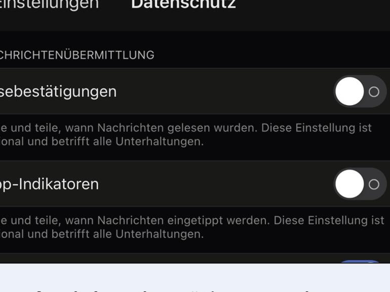 3. Auch Lesebestätigungen lassen sich deaktivieren. Den entsprechenden Eintrag findest du direkt über dem Schalter für die Tipp-Indikatoren. Stelle den Schalter hier auf „Aus“.