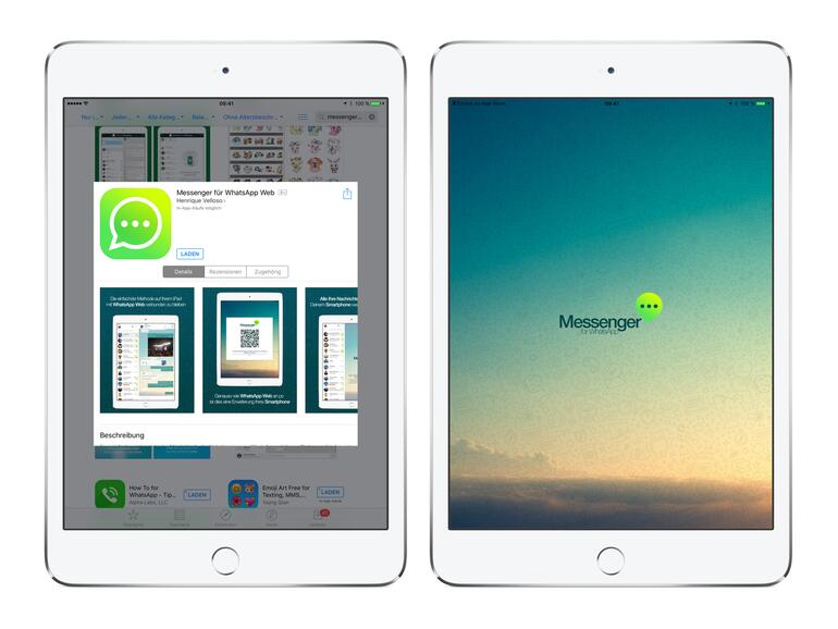 Im App Store gibt es ein Vielzahl von Apps, die dir WhatsApp auf dem iPad versprechen. Jedoch fehlt oftmals eine wichtige Funktion - die Benachrichtigungen. Wir haben daher für unser Beispiel die App "Messenger für WhatsApp Web" von Hinrique Velloso ausgewählt.
