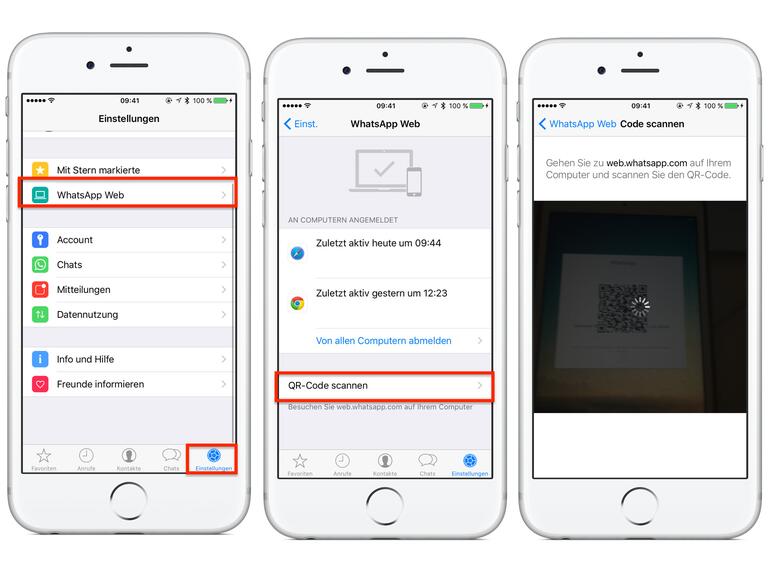 Schritt 7: Tippe dann auf "WhatsApp Web" und anschließend auf "QR-Code scannen". Solltest du noch keine Gerät verbunden haben, dann wird der QR-Scanner direkt geöffnet.