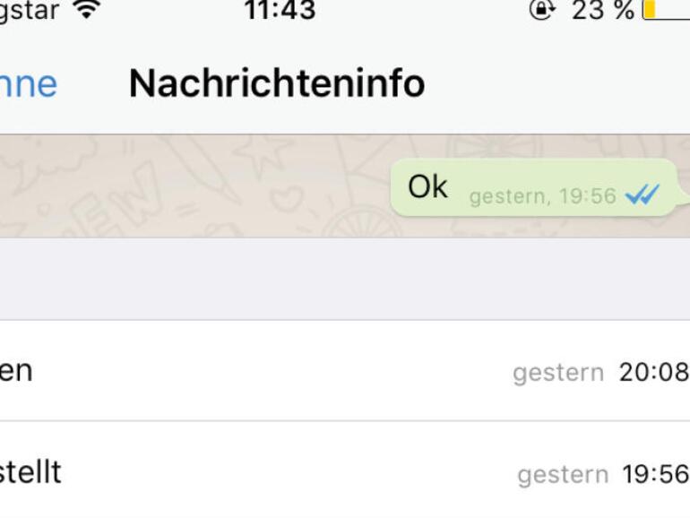 Gelesene Nachrichten werden in WhatsApp gut sichtbar mit zwei kleinen blauen Häkchen versehen. Manchmal will man aber nicht nur wissen, dass eine Nachricht gelesen wurde, sondern auch ganz genau wann. Um diese Information zu bekommen, halten Sie einen Finger auf der entsprechenden Nachricht und wählen Sie aus dem aufpoppenden Kontextmenü den Eintrag „Info“. Sie erhalten daraufhin Einblick in die sogenannte Nachrichteninfo samt Sende-, Zustellungs- und Lese-Zeitpunkt. Alternativ erreichen Sie diese Auflistung übrigens auch, wenn Sie ganz einfach mit einem Finger über die entsprechende Nachricht nach links streichen.