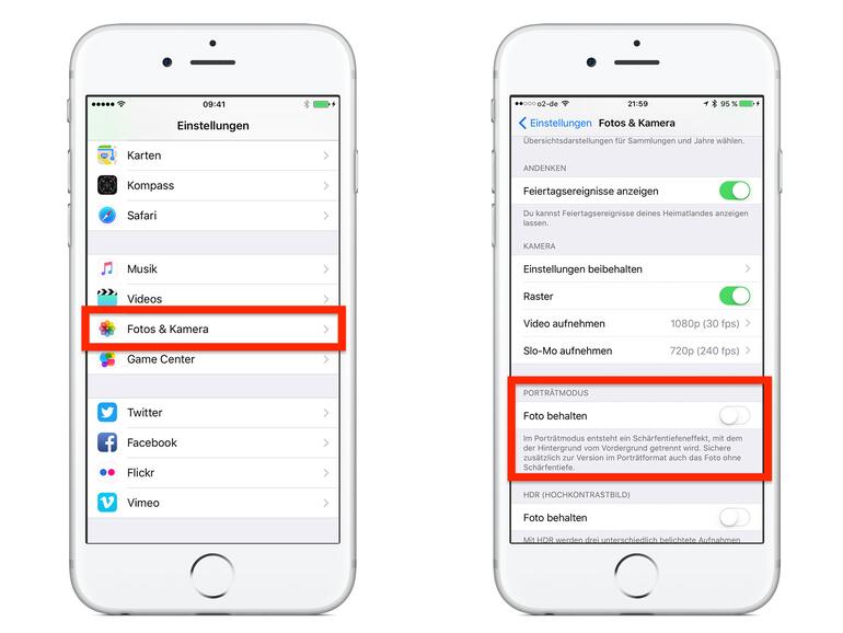 Nehmen Sie zunächst Ihr iPhone 7 Plus zur Hand und öffnen Sie dann die Einstellungs-App. Scrollen Sie nun nach unten, bis Sie den Menüpunkt „Fotos & Kamera“ sehen. Tippen Sie ihn an. Am unteren Ende sehen Sie unter der Überschrift „Porträtmodus“ die Option „Foto behalten“. Ziehen Sie den Schieberegler nach links, um zukünftig nur noch die Aufnahme mit dem Schärfentiefeneffekt zu sichern.