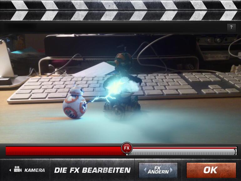 Action Movie FX macht Hollywood-Spezialeffekte auf iOS-Geräten möglich. Einen Effekt erzeugen ist ganz einfach. Du wählst die entsprechende Szene über die Vorschau aus. Du filmst eine vorgegebene Zeitspanne und richtest die Kamera mit einer Positionierungshilfe auf den Untergrund aus. Im nächsten Bildschirm richtest du den Spezialeffekt, also zum Beispiel die Explosion auf den Boden aus. Nach Bestätigung wird der Effekt in das Bild eingerechnet. Dabei liefert Action Movie FX nicht nur computergenerierte Bilder wie die Explosion, sondern auch noch die passenden Soundeffekte dazu. Die App liefert immer wieder spaßige Effektpakete nach, aktuell gibt es ein Star-Wars-Paket mit BB-8, Darth Vader und Imperialen Läufern.