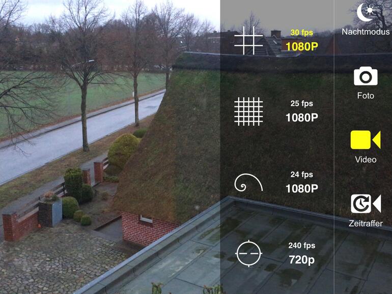 Pro Cam bietet ähnlich wie Filmic Pro sehr viel mehr Einstellmöglichkeiten als die Standard-Kamera-App von iOS – bei Foto- und Videoaufnahmen. So sind Auflösung und Framerate immer im Blick, es gibt verschiedene Linienraster zum Ausrichten, Nachtmodi und einen präzisen Zoom. Im Gegensatz zu Filmic Pro gibt es die Pro Cam 3 auf Deutsch.