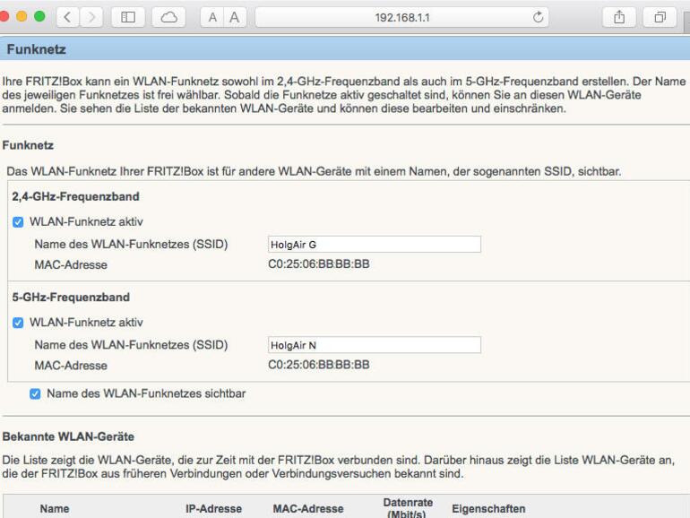 Router wie hier die Fritzbox 7390, die sowohl im 2,4- als auch im 5 GHz-Band funken können, gestatten meist, beide unterschiedlich zu benennen. So kann man an Geräten wie MacBooks oder iPhones einfach nachsehen, ob man gerade schnell oder langsam surft. Wer keine langsamen WLAN-Geräte betreibt, kann das 2,4-GHz-Netz eventuell sogar abschalten. Aber Vorsicht: Im 5-GHz-Bereich ist die Reichweite des Netzes deutlich geringer, deckt schon etwas größere Wohnungen kaum ab und ist nur im direkten Umfeld des Routers schnell, wird aber mit zunehmender Entfernung langsamer.