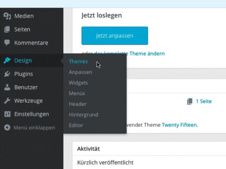 Melde dich bei Wordpress an. Alle Einstellungen, die das Aussehen deiner Website betreffen, findest du links am Fensterrand im Bereich „Design“. Rufe dort den Eintrag „Themes“ auf.