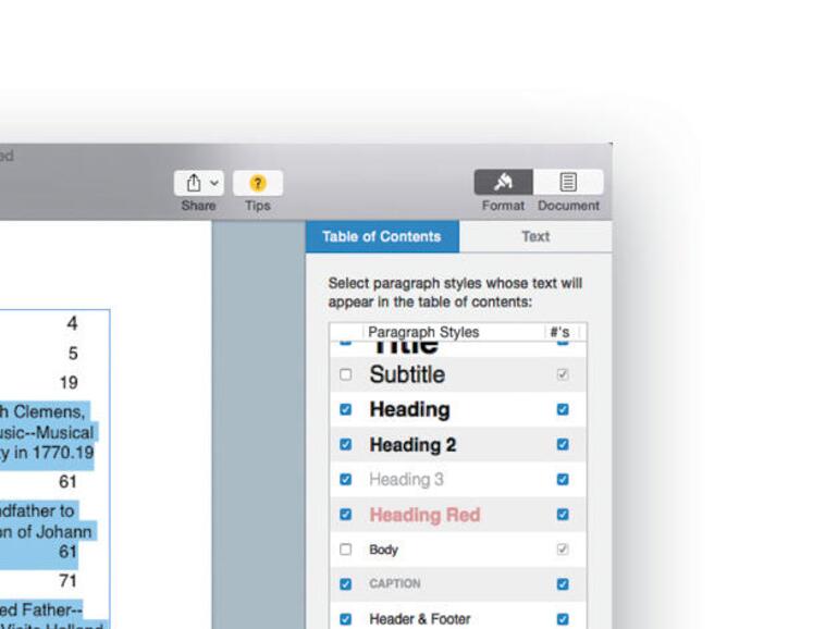 Wenn Sie auf das Inhaltsverzeichnis in Pages klicken, erscheint ein neuer Bereich im Format-Inspektor, über den Sie ein paar Änderungen am Aussehen des Inhaltsverzeichnisses vornehmen können.