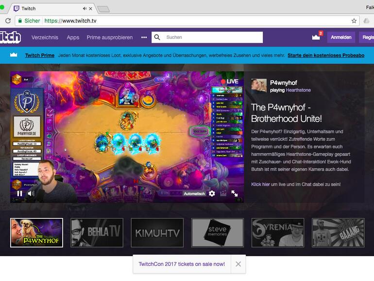 Als Amazon-Prime-Kunde verwandeln Sie Ihr Twitch-Konto kostenfrei in ein Premium-Konto. Dazu klicken Sie auf den Knopf „Prime ausprobieren“ auf der Startseite von Twitch.