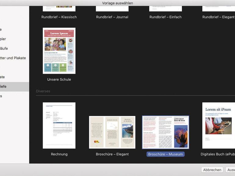 Sicherlich sind viele der von Apple aus dem Leistungsumfang gestrichenen Funktionen in der papierlosen Arbeitswelt 4.0 längst überflüssig. Dennoch gibt es Bereiche, in denen es eben doch noch auf die Papierform ankommt. Etwa in der Vereinsarbeit, wenn der Schriftführer die Mitglieder zur Jahresversammlung einlädt. Zudem gibt es immer noch Kunden, die nur reagieren, wenn man ihnen einen personalisierten Brief schickt. Und nicht zuletzt lassen sich mit Pages Info-Flyer und Werbemittel erstellen, die sich vor professionellen Produkten nicht zu verstecken brauchen. Die Vorlagen für doppelseitige Broschüren befinden sich im Bereich „Rundbriefe“ im Standarddialog „Vorlage auswählen“. Dieses Fenster zeigt Pages gleich nach dem Start an. Das Menü „Ablage > Neu“ holt ebenfalls die Vorlagenauswahl auf den Schirm.