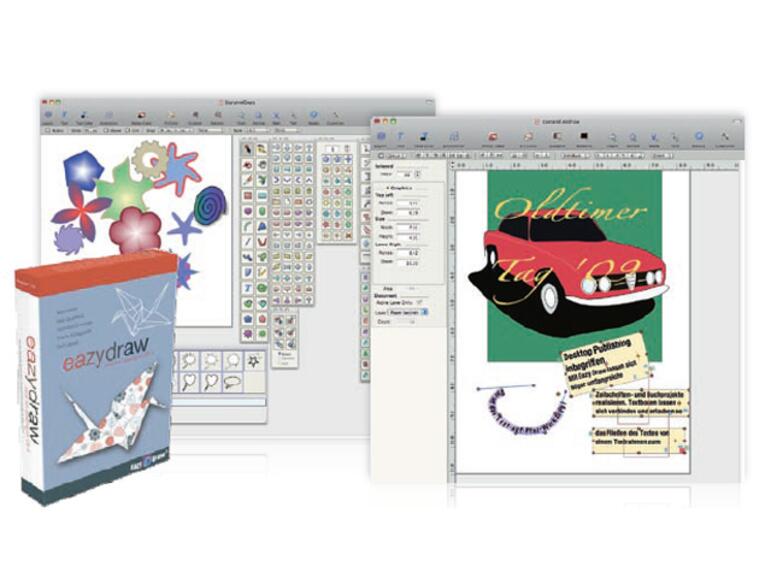 Mit EazyDraw lassen sich sogar umfangreiche Zeitschriften- und Buchprojekte realisieren. Textboxen lassen sich verbinden und erlauben so das Fließen des Textes von einem Textrahmen zum nächsten. Textpfade ermöglichen sehr kreative Satzmöglichkeiten. Ein eindrucksvolles Beispiel für die Leistungsfähigkeit ist das knapp 400 Seiten dicke Handbuch, das vollständig mit EazyDraw erzeugt wurde.