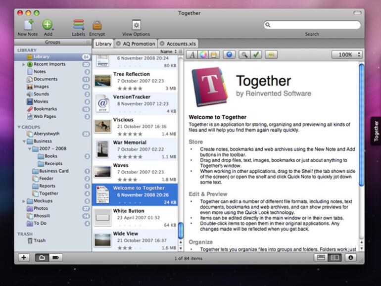 Ansonsten stehen formatübergreifend Kommentarfeld, Stichwörter, Etikett und Bewertung zur Verfügung. Diese Daten lassen sich für intelligente Gruppen nutzen, die sich automatisch füllen und so etwas Ordnung in das bunte Dateichaos bringen. Textdateien, Bilder, Töne, Filme, Lesezeichen und Webseiten werden automatisch erkannt und in die jeweilige Kategorie eingeordnet. Die Bearbeitung von Textdateien erfolgt direkt im Programm, für andere Dateitypen muss eine passende Anwendung gestartet werden. Together „lernt“ aus vergebenen Stichwörtern und wendet sie optional bei ähnlichen Texten automatisch an. Ergänzt wird das Programm durch eine Art Schnell-Notizblock, der am Bildschirmrand klebt.