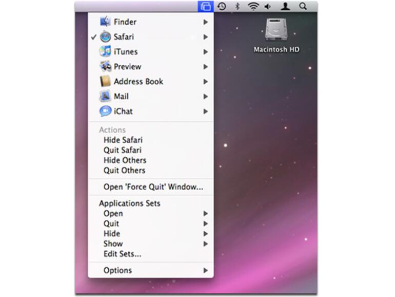 Ausgerechnet die namensgebende Funktion ist auch die langweiligste, denn Programme, die eine Liste der laufenden Anwendungen in der Menüleiste anzeigen, gibt es wirklich schon genug. Einen besseren Eindruck machen die Anwendungs-Sets, die einige Klicks ersparen können.