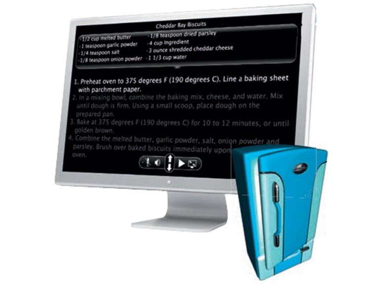 Computer haben in der Küche eigentlich nichts verloren: Pfannkuchen, Toastbrote und Tomatenspritzer sind klassische Tieffl ieger, die bevorzugt auf dem Mac landen. Doch es gibt einen Weg, den Mac in sicherer Distanz aufzustellen: Im Vollbildmodus wird das Rezept mit einem großen Schriftsatz dargestellt und die aktuelle Kochanweisung Teleprompter- artig hervorgehoben. Gesteuert wird das Programm in diesem Modus entweder per Apple-Fernbedienung oder Spracherkennung. Letztere sollte vorher auf die gewünschte Entfernung kalibriert werden. Natürlich meldet sich das Programm auf Wunsch auch selbst zu Wort und liest den Text vor. Wer damit nicht zurechtkommt, druckt das Rezept aus und arbeitet auf die ganz altmodische Weise.