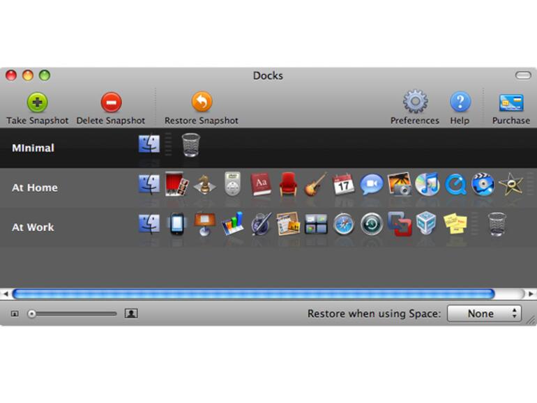 Hier setzt Docks an: Das Programm merkt sich den aktuellen Zustand des Dock und sichert ihn unter dem gewünschten Namen zur späteren Verwendung. Gleich zu Beginn wird das aktuelle Dock gesichert und kann dann gefahrlos verändert werden. Sind die Änderungen abgeschlossen, wird der Zustand erneut gespeichert, und ein weiteres Dock lässt sich anlegen.