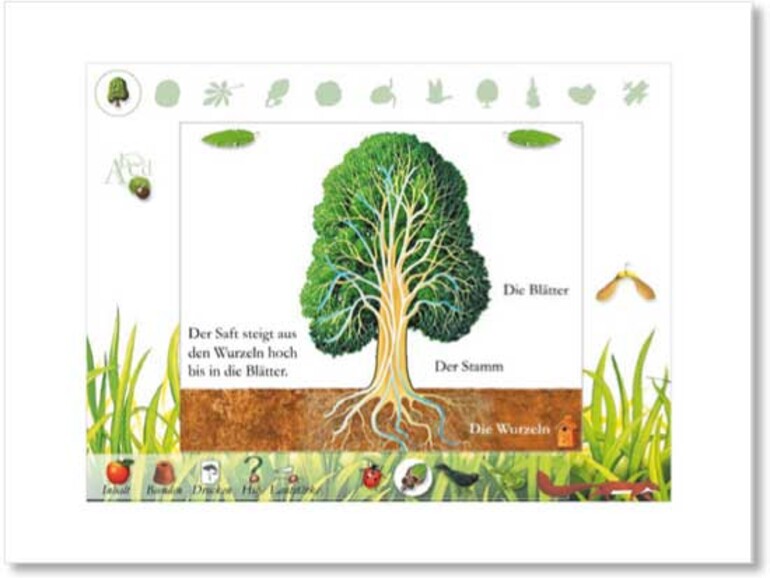 Die vier Themen sind bereits für Kinder ab drei Jahren gedacht und größtenteils zielgruppengerecht aufbereitet. In kurzen und aussagekräftigen Texten erklärt der Sprecher, unterlegt mit entsprechenden Animationen, wie sich ein Ei entwickelt oder die Kaulquappe zum Frosch wird. Neben Vogel, Amphibien und Insekterläutert die CD aber auch das Ökosystem Baum, dessen Aufbau, Jahreszeitenentwicklung und Fortpfl anzung. In nahezu jedem Bild können die Kinder durch Klicken oder Ziehen aktiv am Geschehen teilnehmen, so dass die Erläuterungen eher beiläufi g erfahren werden.