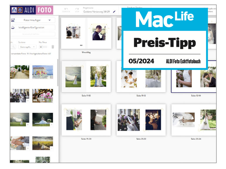 Aldi Foto liefert ein Echtfotobuch ohne Extras. Diese lassen sich auch nicht optional auswählen. Die Druck- und Verarbeitungsqualität sind jedoch sehr gut. Wer auf optische Besonderheiten wie ein schickes Leinen-Cover verzichten kann, kann guten Gewissens zugreifen.