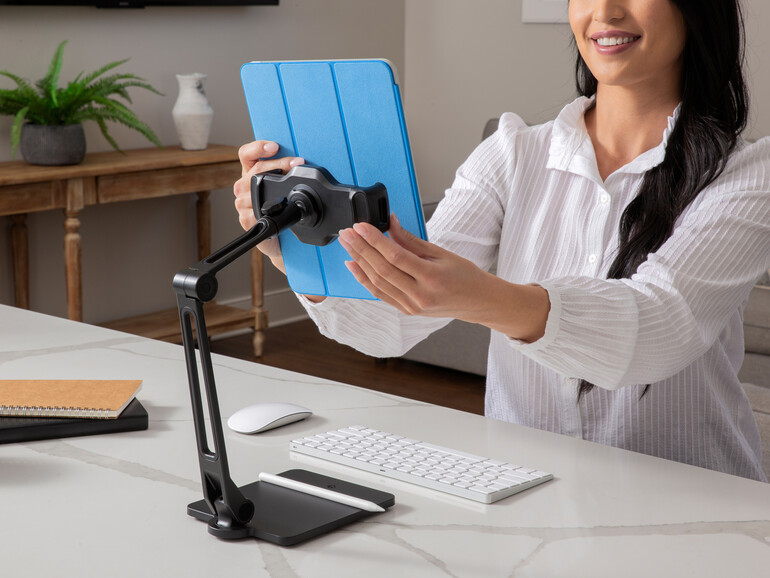 Das iPad entwickelt sich dank Apples Bemühungen rund um das Betriebssystem iPadOS immer mehr zu einer vollwertigen Alternative zu PCs oder Macs. Das liegt nicht zuletzt an der Möglichkeit, per Bluetooth oder über Adapter Tastaturen und Mäuse daran nutzen zu können. Doch damit du es auch langfristig und vor allem bequem nutzen kannst, benötigst du eine entsprechende Halterung, die du bestenfalls je nach deinen Ansprüchen neigen, verstellen oder beiseite räumen kannst.