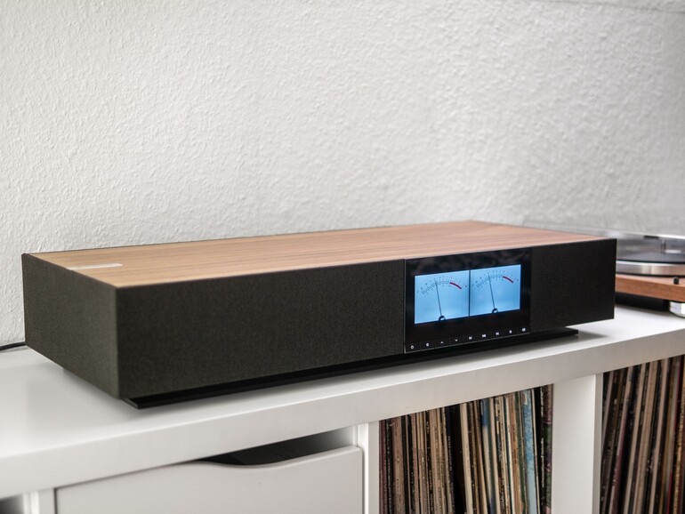 Und schwer ist das Gerät! 14,5 Kilogramm bringt der Evo One auf die Waage. Dennoch erweckt die geschickte Unterkonstruktion den Eindruck, als würde der massive Klangklotz schweben. Das 6,8-Zoll-Farbdisplay ist ein echter Hingucker und sitzt in der rechten Hälfte der Front. Es kann neben der Uhrzeit und Informationen zur Wiedergabe auch ein vu-Meter anzeigen, was dem Evo One einen zusätzlichen Retro-Charme verleiht. Leider kennt es nur drei Helligkeitsstufen, von denen eine „Aus“ bedeutet.