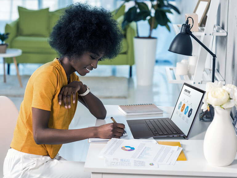 Hinzu gesellt sich eine einzelne USB-3.2-Schnittstelle in Typ-A-Ausführung – immer gern gesehen zum Anschluss älterer Peripherie. Die Asus-Techniker:innen schafften es zudem, einen HDMI-Monitoranschluss in dem flachen Gehäuse unterzubringen. Dieser liefert bis zu 60 Hertz an einen 4K-Bildschirm, vermeidet aber auch bei der Verbindung etwa mit einem Beamer oder Fernseher im Präsentationsraum das Mitführen lästiger Adapter. Schön, dass diese nützliche, aber etwas sperrige Buchse zumindest im Profisektor wieder so etwas wie eine Renaissance erfährt – siehe auch das neue MacBook Pro.