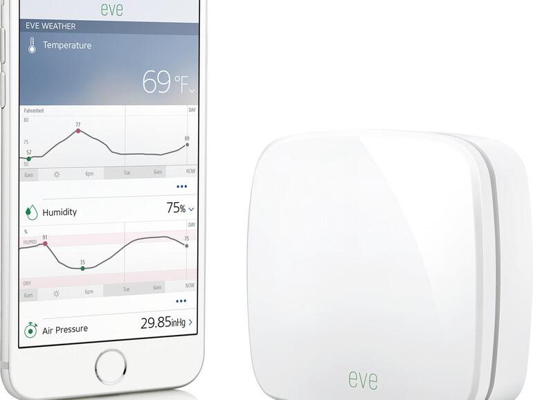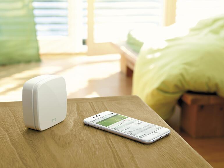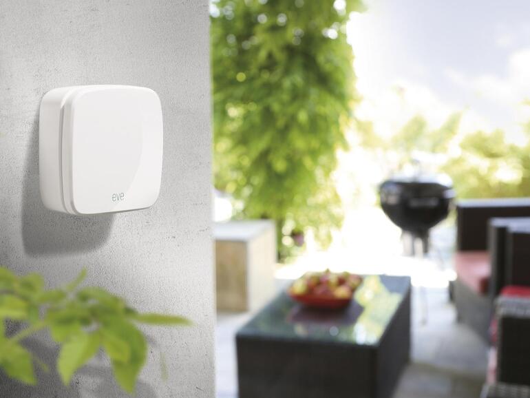 Für viele Entscheidungen, die in einem smarten Zuhause anstehen, ist das Klima ein ausschlaggebender Faktor. Das hat auch Elgato erkannt und bringt mit „eve room“ und „eve weather“ je ein Gerät für das Raum- und das Außenklima auf den Markt. Das Modul für den Innenraum verfügt über Sensoren für die Temperatur und die Luftfeuchtigkeit. Darüber hinaus steckt noch eine Einheit zur Bestimmung der Luftqualität darin. Anders als ähnliche Sensoren misst das Gerät dabei nicht nur den CO2-Gehalt in der Luft, um zu entscheiden, wann die Luftqualität zu schlecht ist. Eve Room nutzt einen modernen Sensor zur Analyse sogenannter VOCs – flüchtiger organischer Verbindungen – und erkennt somit auch zu hohe Konzentrationen anderer Stoffe in der Luft. Zwischen den einzelnen Stoffen unterscheiden kann Eve Room allerdings nicht.