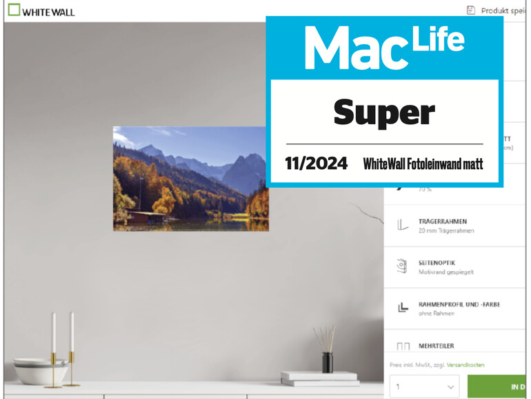 Bei WhiteWall haben Sie die Wahl zwischen einer matten und einer glänzenden Fotoleinwand sowie einer Textil-Print-Variante mit schimmernder Oberfläche. In unserem Test haben wir die matte Fotoleinwand unter die Lupe genommen, die eine exzellente Qualität aufwies.