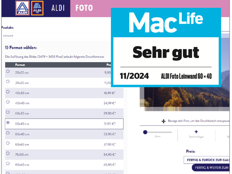 Auch Aldi überzeugt, passend zum Discounter, mit einem sehr günstigen Preis für seine Leinwand. Die Qualität ist identisch zu der von Meinfoto. Auch hier stimmen Material, Druck und Verarbeitung – bis auf die Einschränkung der etwas zu blass geratenen Farben.