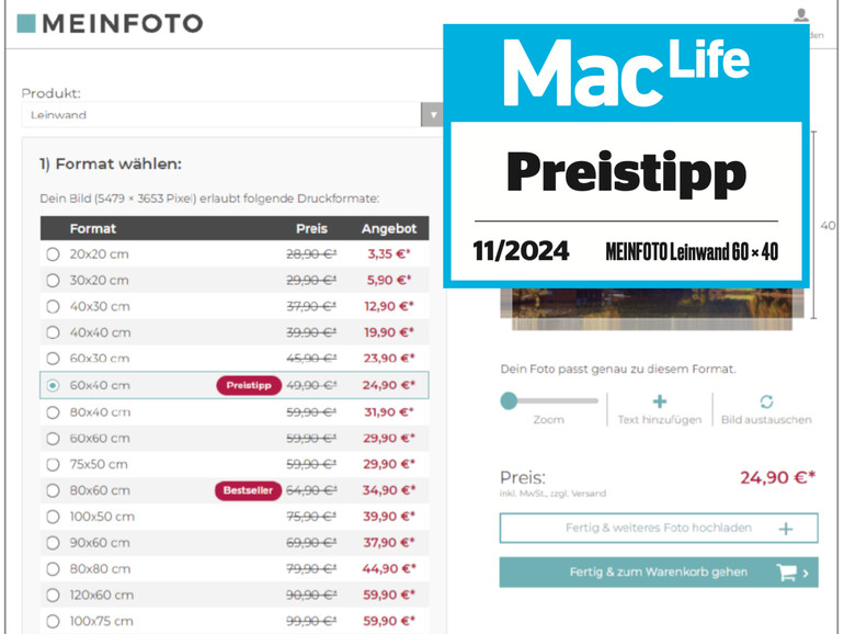 In unserem Test haben wir für Sie Fotoleinwände im Format 60 × 40 cm unter die Lupe genommen. Dabei war die Preisspanne bei den sieben Testteilnehmern enorm. Beim günstigsten Anbieter Meinfoto.de zahlen Sie für die Leinwand inklusive Versand 31,80 Euro. Beim teuersten Fotobook mit 74,98 Euro mehr als das Doppelte.