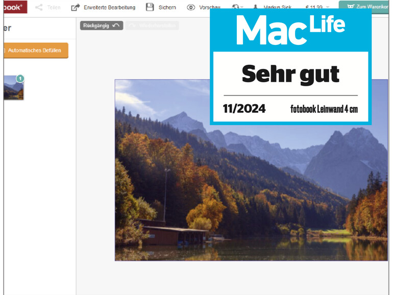 Extrem wuchtig kommt die Fotoleinwand von Fotobook mit ihrem 4 cm dicken Holzkeilrahmen daher. Alternativ stünde jedoch auch eine günstigere Variante mit 2 cm zur Auswahl. Die Qualität der Leinwand ist sehr gut. Bei der Online-Gestaltung ist noch etwas Luft nach oben.