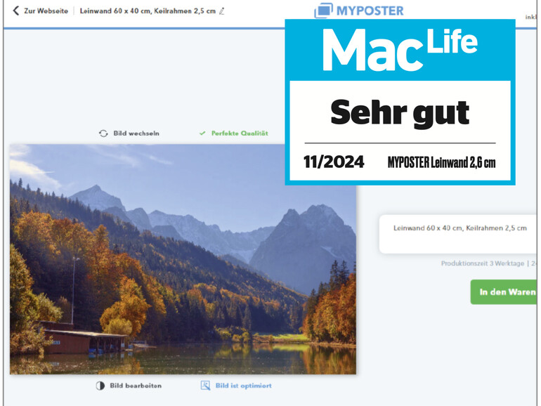 Deutlich günstiger als die bisherigen Testkandidaten ist die Fotoleinwand von Myposter zu haben, die einen dickeren, 2,5 cm messenden Rahmen mitbringt. Die Druckqualität ist spitze und landet nur minimal hinter den besser platzierten Teilnehmern.