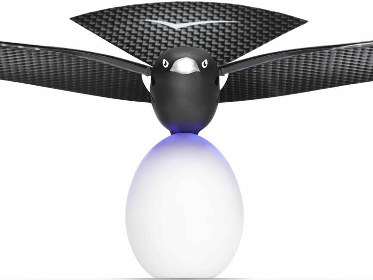 Fluggerät: Quadrocopter gibt es viele auf dem Markt, doch dieser Vogel fliegt ganz ohne Rotoren. Vielmehr ahmt er die Flügelschläge echter Vögel nach. Und das funktioniert erstaunlich gut! Zum Starten benötigt er ein wenig Anschwung, doch dann erhebt sich das gerade einmal 9,2 Gramm schwere Leichtgewicht in die Lüfte und ist mit einem per Bluetooth gekoppelten Smartphone steuerbar. Eine Akkuladung reicht für maximal 7 Minuten Flugzeit. Zum Glück wird ein Akkupack – passenderweise als Ei getarnt – mitgeliefert, der das Feder(lose)vieh binnen 12 Minuten wieder auflädt und das bis zu zehn Mal.