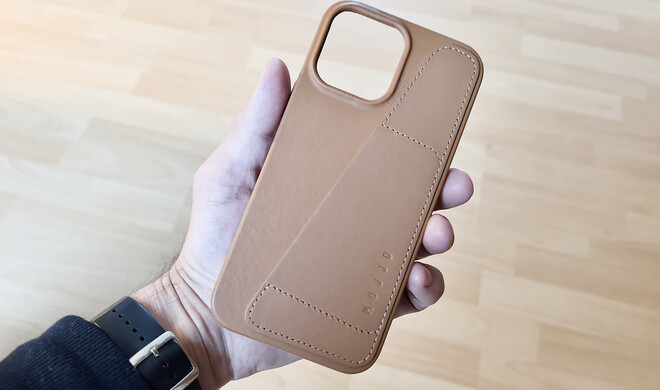 Hülle: Die Hülle aus pflanzlich gegerbtem Leder der niederländischen Manufaktur Mujjo ist hochwertig verarbeitet und entwickelt mit der Zeit eine angenehme Patina. Die Knöpfe sind trotz Lederüberzug präzise bedienbar, die Aussparungen sauber gearbeitet und passgenau. Vorn steht das Case einen Millimeter über, sodass das Glas geschützt ist, gleiches beim Kamerabuckel hinten. Durch den exakt aufgenähten Einschub mit Platz für zwei bis drei Karten liegt das iPhone auch in Rückenlage plan auf. Leider ist sie dadurch zu dick für MagSafe.