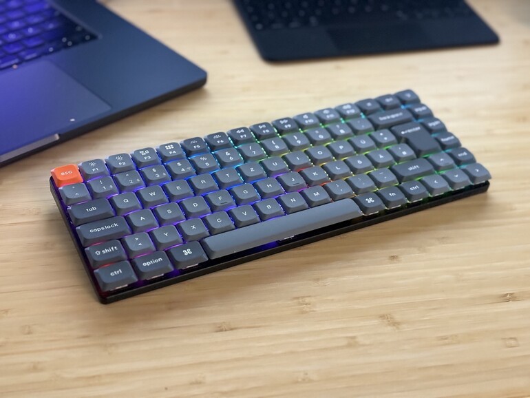 Die Keychron K3 Max ist eine kleine, mechanische Tastatur, die Produktivität und Portabilität in einem kompakten 75-Prozent-Layout vereint. Mit einer Höhe von nur 17 bis 22 Millimetern und einem Gewicht von 525 Gramm ist sie äußerst mobil, während der Aluminiumrahmen für Stabilität sorgt. Das schlichte graue Design mit orangefarbener Escape-Taste macht sich gut auf dem Mac-Schreibtisch.