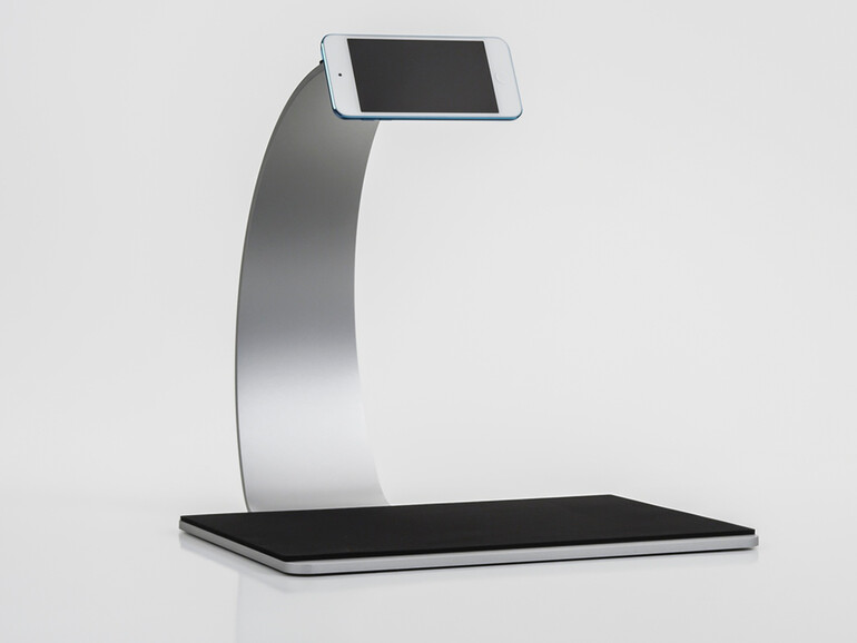 iPhone-Foto-Stativ: Mit dem Scanpad, einer metallenen Haltevorrichtung für das iPhone (oder natürlich auch andere Smartphones) gelingt professionelle Produktfotografie ganz einfach. Der Trick sind Gummimatten, die dank Nanotechnologie aus zahlreichen Mini-Saugnäpfen bestehen und so nicht nur sicheren Halt für das oben angebrachte iPhone, sondern auch für die darunter platzierten Gegenstände bietet. Die Matten sind in verschiedenen Farben zu haben, so dass auch das nachträgliche Freistellen von Objekten in der Bildbearbeitung leichter fällt. Scanpad wird in Deutschland gefertigt. ssc