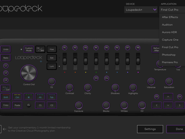Allrounder: Mit dem Loupedeck+ lassen sich Videos, Audiodateien und Fotos bearbeiten – die Tastatur unterstützt zahlreiche gängige Programme von Apple, Adobe und Skylum. (Bild: Loupedeck)
