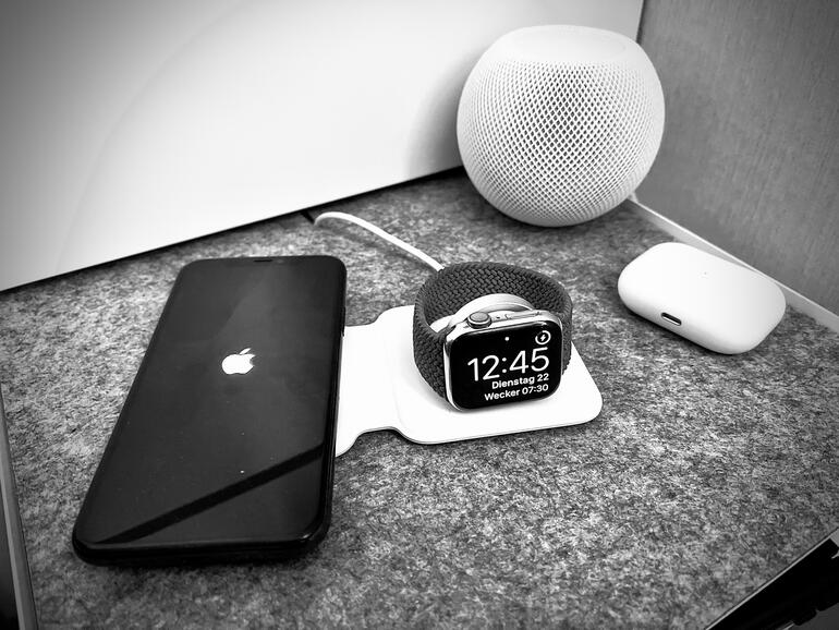 Die kleine Ladeeinheit ist typisch Apple. Viel weiß, ein Anschluss und ein eingeprägtes Apple-Logo. Es vereint das magnetische Ladedock der Apple Watch mit dem MagSaf...