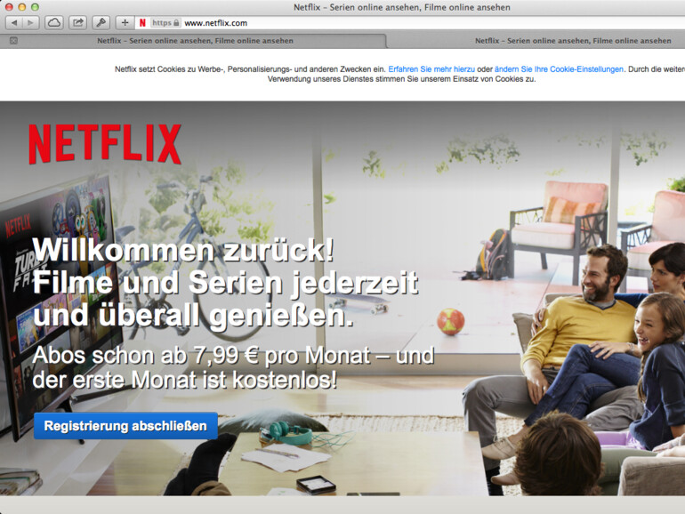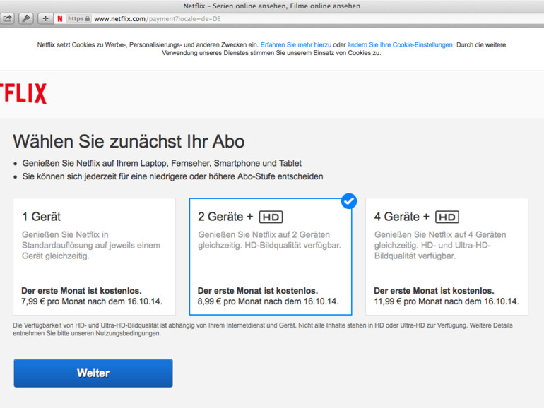 Über Netflix.com können sich deutsche Anwender seit heute morgen bei den Dienst anmelden. Nach Eingabe einer E-Mail-Adresse und Wahl eines Passwortes steht zunächst die Tarifwahl an, der erste Monat ist dabei jeweils kostenlos. Für 7,99 Euro lässt Netflix auf jeweils einem Gerät in Standardauflösung nutzen. Die Nutzung auf zwei Geräten gleichzeitig in HD-Qualität kostet 8,99 Euro. Für 11,99 Euro gibt es Netflix auf vier Geräten gleichzeitig in HD- und Ultra-HD-Qualität. Gezahlt werden kann – das ist vorbildlich – per Kreditkarte, PayPal oder Bankeinzug.