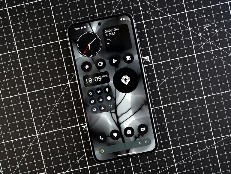 Neu in Nothing OS 2.0 als Android-Überbau ist die nochmals reduzierte Designsprache. Hier gefällt, dass die Bedienoberfläche in keiner Weise in bunten Farben „schreit“: Weiß, Schwarz, Grau – und als Akzent: Rot. Selbst auf der Ebene von Icons der Apps Dritter ist die Palette auf das Monochrome reduziert. Das steht im Gegensatz zur Optik von iOS, bei der sich viele Icons anfühlen wie kleine Werbeplakate. Farbe hat Wiedererkennungswert, aber der reduzierte Einsatz dieses Reizes wirkt angenehm sachlich und strukturierter als das bunte Durcheinander andernorts – wir fühlten uns oft an die Schlichtheit des ikonischen Designs der Schweizer Bahnhofsuhr erinnert.