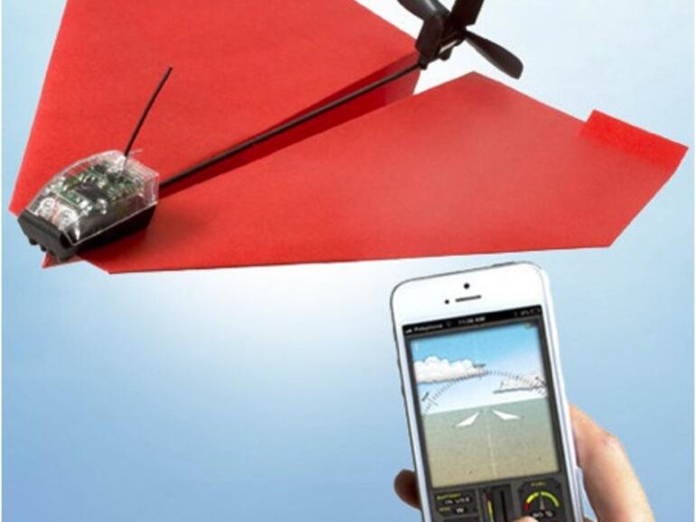 Und wie steuert man das Ganze? Mit einer passenden App, die via iTunes den Weg aufs iPhone findet. Die Steuerung selbst ist nicht ganz trivial, ein wenig Eingewöhnung ist vonnöten. Doch das Ding fliegt tatsächlich – und das gar nicht mal so schlecht. Die ersten Flugversuche sollte man bei mäßigen Wind oder besser Windstille draußen machen, um sich mit der Steuerung vertraut zu machen. Dann aber kann man mit etwas Geschick ziemlich Spaß mit dem Motor am Papierflugzeug haben.