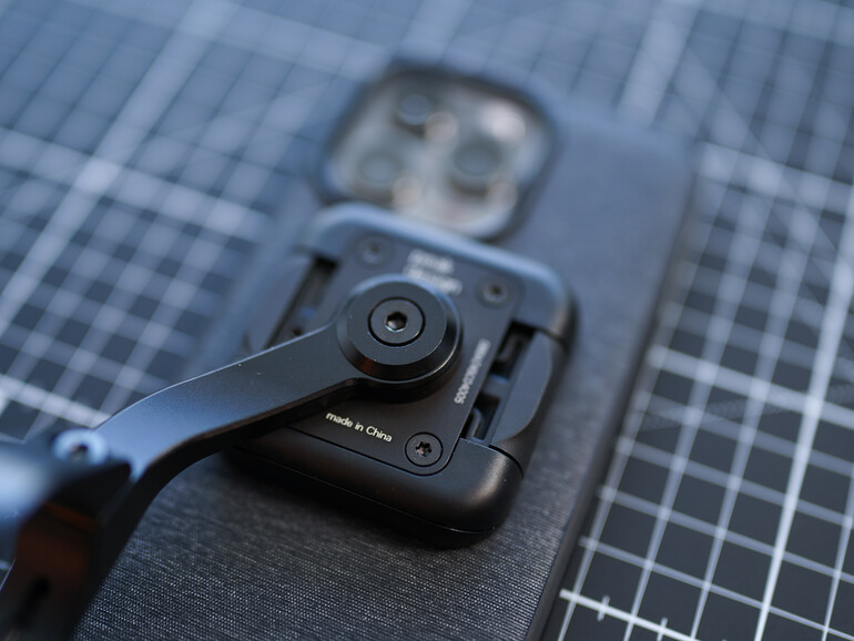 So weit, so unauffällig. Zwei Dinge aber unterscheiden das „Everyday Case“ von anderen Hüllen. Zum einen steckt in ihr ein zu MagSafe-Zubehör kompatibler Magnetring. Zum anderen ziert die Rückseite eine kleine quadratische Einbuchtung, gefasst in Zirkonkeramik, für die andere Zubehörteile der „Mobile“-Serie ein Gegenstück in Form einer Halteplatte mit Haken vorhalten. Peak Design nennt seine Kombination aus magnetischen und mechanischen Haltemechanismen Slimlink – dazu gleich mehr.