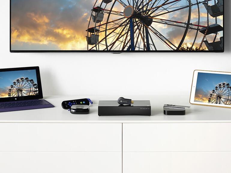 Filme und Fotos können von Konsolen über DLNA auf TV-Geräte und Konsolen gestreamt werden. Besonders komfortabel gelingt das Streaming mit neueren TVs, die automatisch NAS-Festplatten als Quelle entdecken. Zum Beispiel können Samsung-Smart-TVs direkt die Medien von der Personal Cloud abspielen. Apple TV kann über Airplay vom iPhone oder iPad aus die Inhalte über die Seagate-Media-App wiedergeben.
