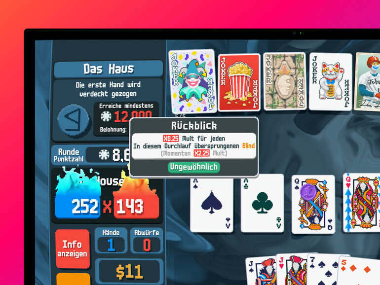 Deckbuilding (Mac/Steam): Balatro entpuppt sich als eine überraschend erfrischende Symbiose aus einem Deckbuilding-Roguelike mit Pokerelementen. Bei der ersten Begegnung mit einem der ersten Überraschungshits des Jahres 2024 Spiel könnte man jedoch annehmen, es handle sich um einen weiteren Versuch, zwei überlaufene Genres miteinander zu verquicken – Balatro jedoch entfaltet schnell seinen eigenen Charme. Mit einer Spielmechanik, die leicht zugänglich, aber herausfordernd zu meistern ist, fordert es die Spielerinnen und Spieler heraus, strategische Entscheidungen zu treffen, die weit über die üblichen Grenzen eines Kartenspiels hinausgehen.