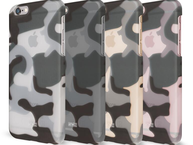 Der Artwizz Camouflage Clip ist ein transparentes Hard-Case für das iPhone SE, 6/6s und 6/6s Plus mit einem eigens designten Tarnmuster in kühlen Grautönen. Das iPhone sitzt passgenau im Case und alle Tasten sind ohne Einschränkung zugänglich und auch die Aussparung für die Kamera wurde perfekt ausgeschnitten. Das Backcover liegt dank Soft-Touch-Oberfläche gut in der Hand und fasst sich angenehm samtig an. Durch die Teiltransparenz schimmert die Farbe Ihres iPhone durch und das in einem Wassertransferdruck-Verfahren aufgetragene Camouflage-Muster verdeckt nicht den Apfel. Der Camouflage-Clip ist sehr gut verarbeitet und trägt durch sein schlankes Design kaum auf.