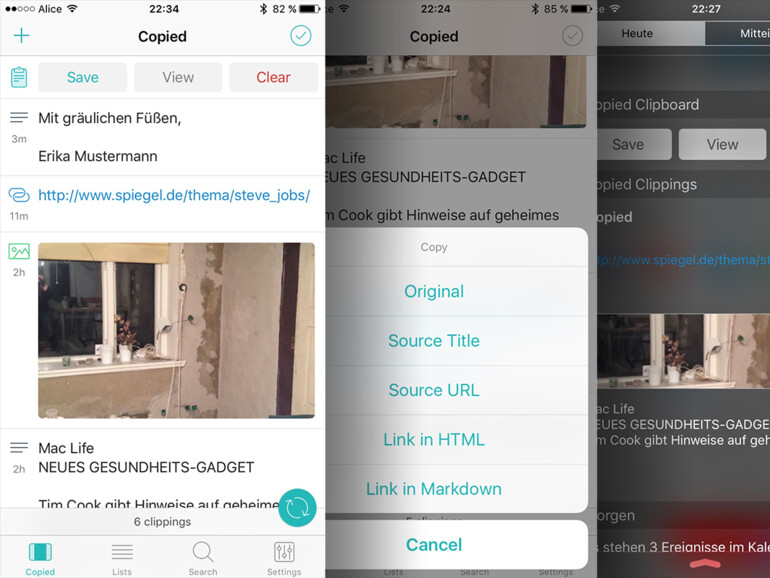 Der Weg in die Copied-Ablage führt immer über die Zwischenablage des Systems und ist damit etwas komplex: Neben dem Sichern in der App selbst gibt es eine Aktion für das Export-Menü vieler Apps. Oder man aktiviert die beiden Widgets in der Mitteilungszentrale. Dann reicht ein Wischer nach unten, um den Save-Knopf zu erreichen, was meist die einfachste Variante ist. Wer die App unter iOS 9 auf einem iPad im Multitasking-Modus betreibt und öffnet, kann den Inhalt der Zwischenablage automatisch in Copied übernehmen. Wer ein iPhone 6s mit 3D Touch besitzt, kann durch einen kräftigen Druck auf das App-Icon die Zwischenablage übergeben.