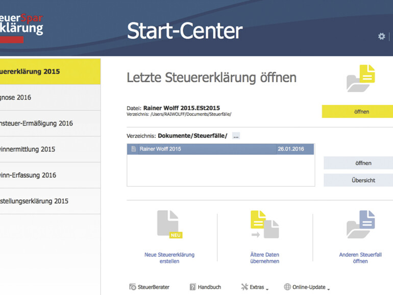 Nach dem Programmstart gelangt man in das Start-Center, von wo aus man in der Regel einen bereits bestehenden oder neuen Steuerfall öffnet. Alternativ kann man im Start-Center eine Steuerprognose für 2016 berechnen, eine Lohnsteuer-Ermäßigung für 2016 beantragen sowie die Gewinnermittlung 2015, die Gewinnerfassung 2016 und die Feststellungserklärung 2015 durchführen. Darüber hinaus kann man nicht nur die Daten aus dem letzten Jahr, sondern auch aus ElsterFormular oder anderen Programmen per PDF übernehmen.