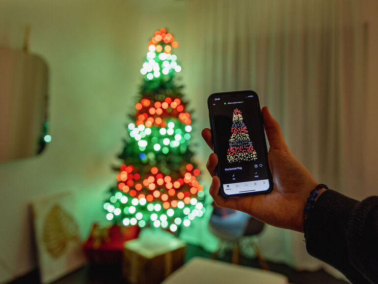 LED-Lichterketten sind bereits für wenig mehr als 10 Euro zu haben. Warum also mehr als das Zehnfache investieren? Der Unterschied: Die Leuchtmittel aus dem Hause Twinkly lassen sich per App programmieren. Das bedeutet im Fall der „Strings“ genannten Lichterkette, dass jede der bis zu 600 LEDs eine eigene Farbe darstellen kann – und das ihrer Position im geschmückten Objekt bewusst. Wer mit LEDs nicht geizt, verwandelt so den Weihnachtsbaum in einen Bildschirm, in dem jeder Lichtpunkt einem Pixel entspricht, der sowohl Teil eines Bildes als auch einer Animation sein kann.