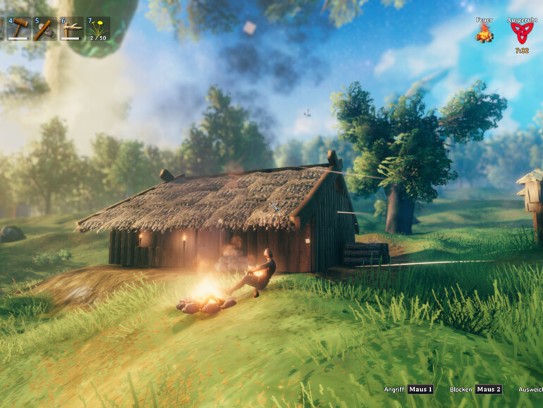 Höchste Zeit für eine Zuflucht. Per Holzhammer erschaffen wir aus den gesammelten Rohstoffen neben einer Werkbank Holzwände und ein Dach. Ein Lagerfeuer sorgt für Wärme und Geborgenheit – was uns übrigens ebenfalls Boni beschert. Aber Obacht: Physik spielt nicht nur bei gefällten Bäumen eine Rolle, sondern auch beim Lagerfeuer im Langhaus. Ohne richtige Belüftung sorgt der dichte Qualm ohne Vorwarnung für unser erstes Ableben.